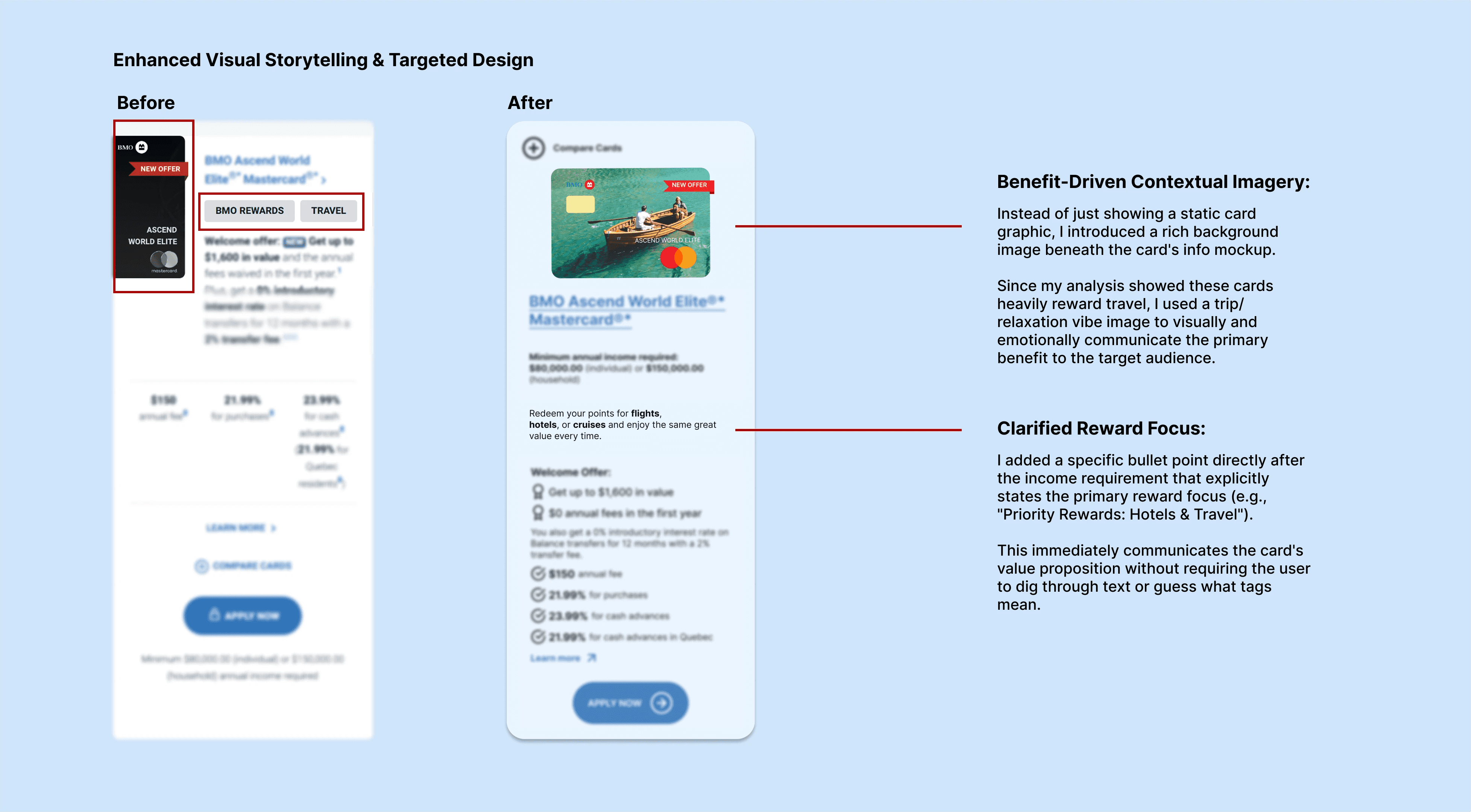 I replaced generic card graphics with benefit-driven imagery and a prominent rewards-focus tag to emotionally and logically connect users to the card’s primary value proposition.
