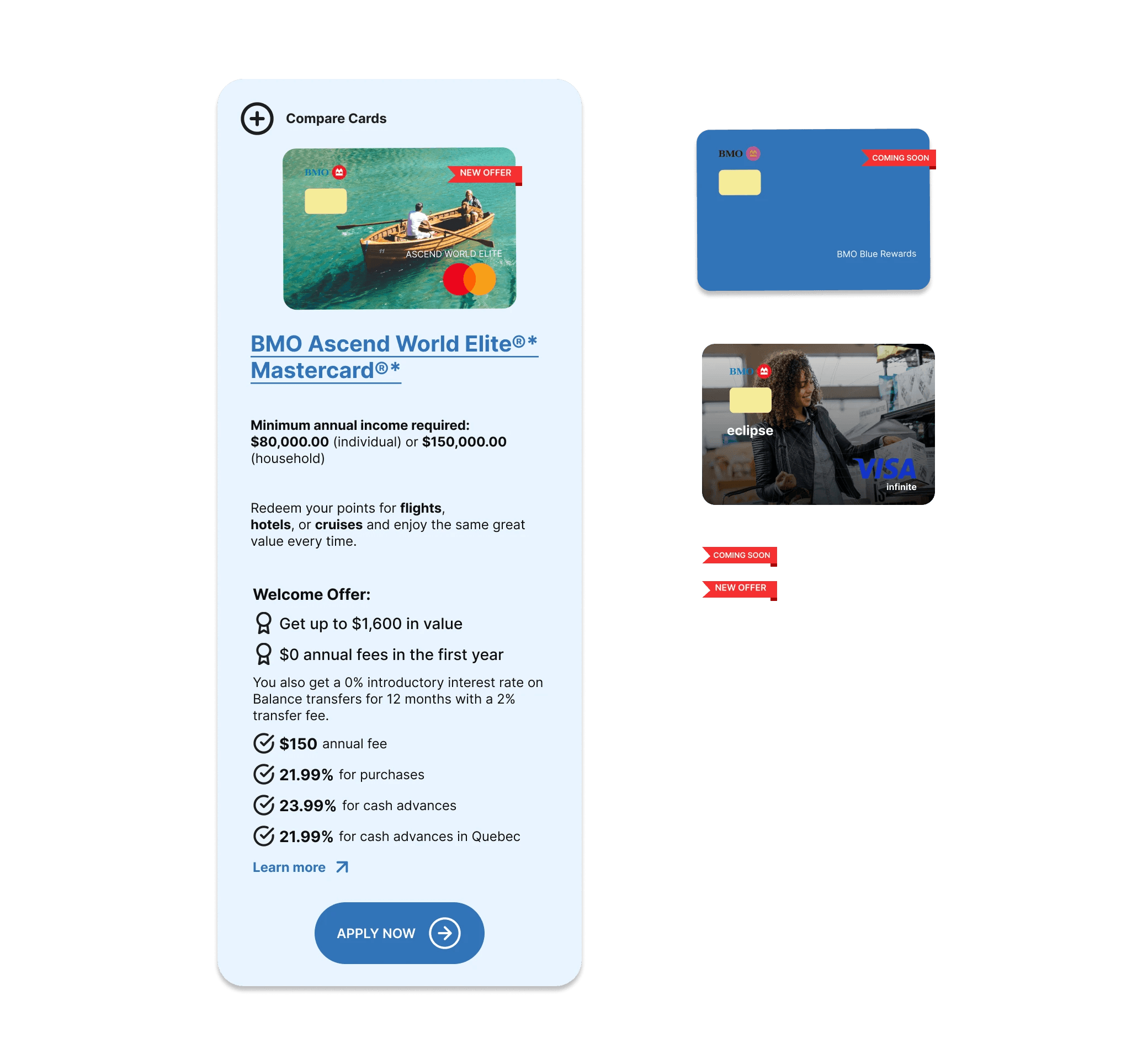 I custom-built card visuals, buttons, and iconography that aligned with BMO’s brand colors while introducing a more modern, premium feel.