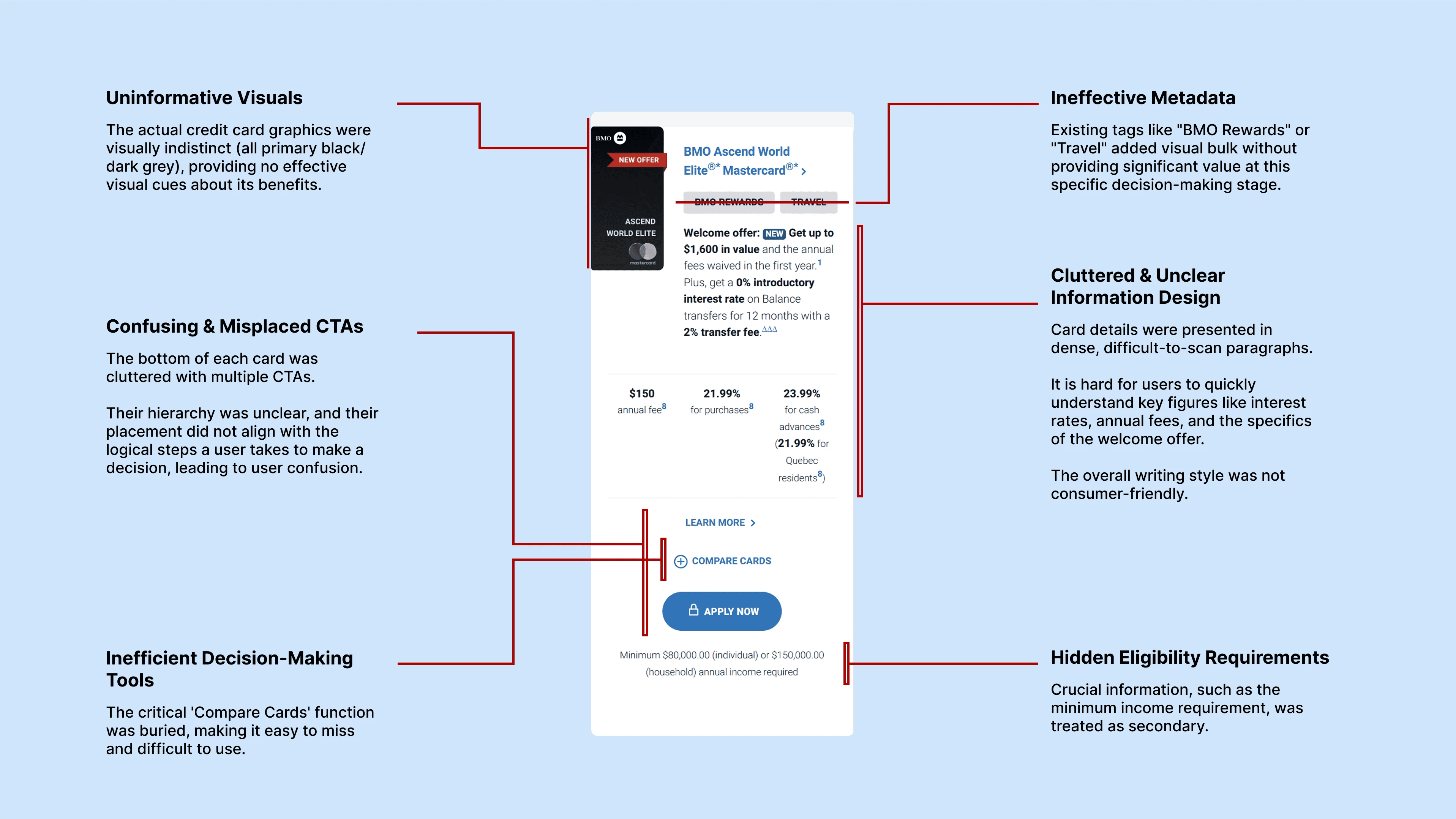 A high-friction layout that hid income requirements and made card comparison an exhausting task for users.